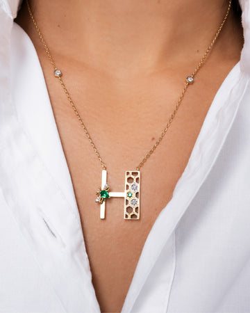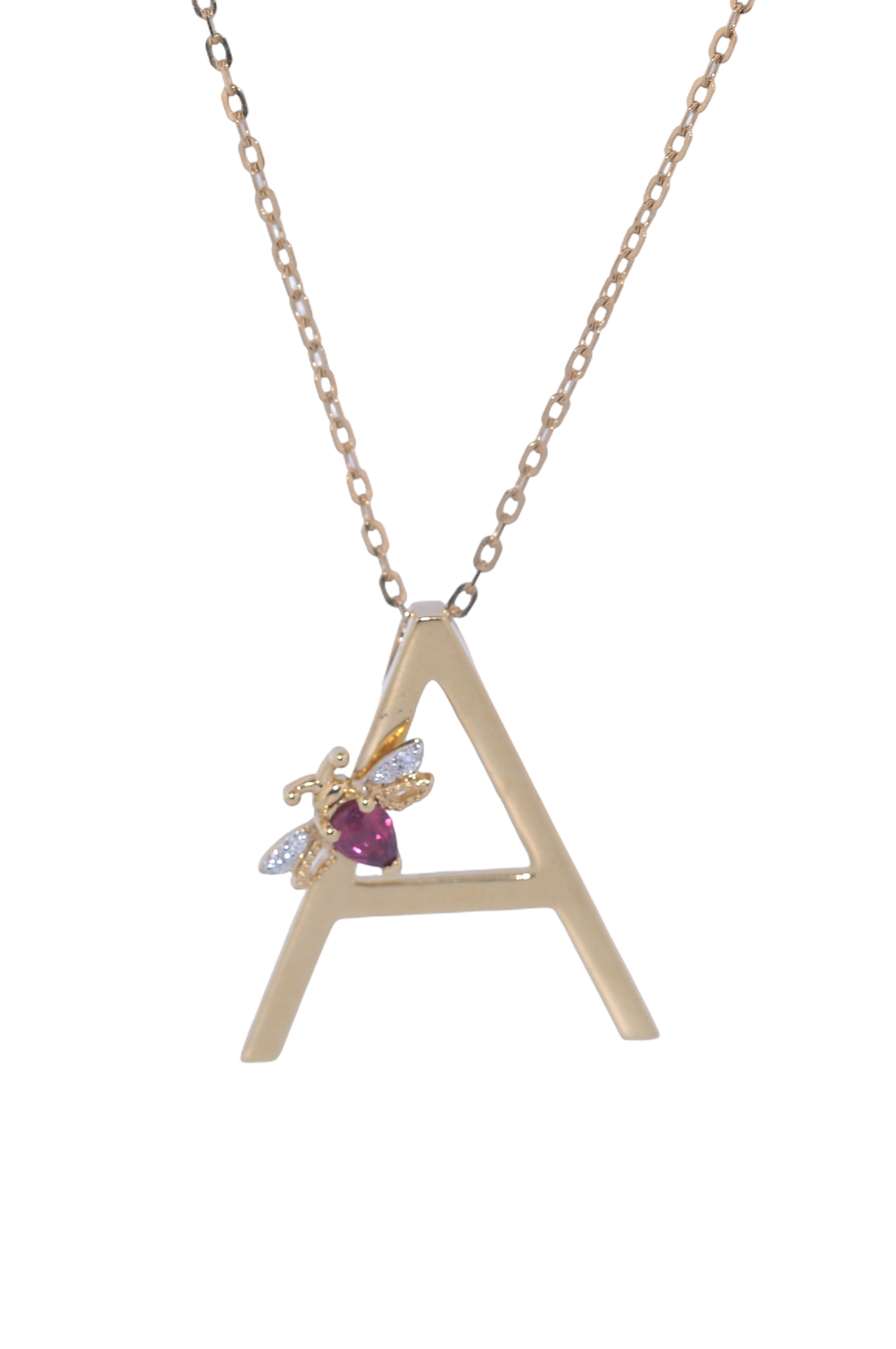 18K Gold "A" Initial Pendant with Diamond & Ruby Bee