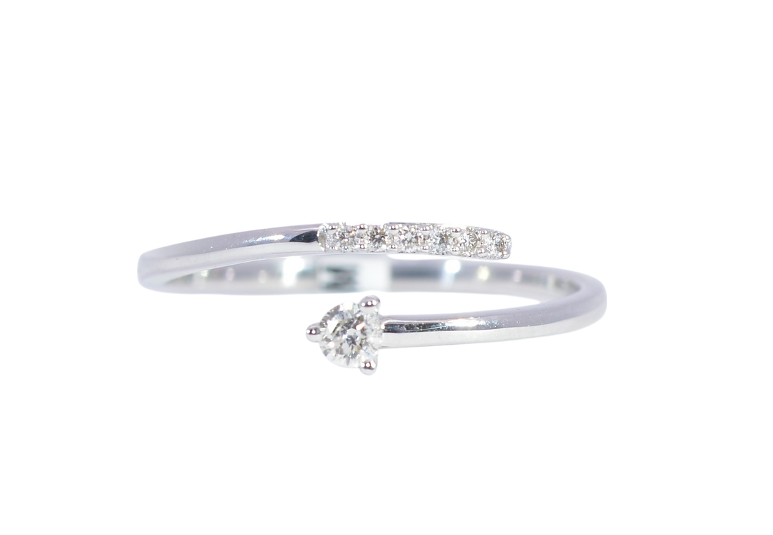 Discover modern elegance with this 18K white gold ring featuring a graceful open design, accented...