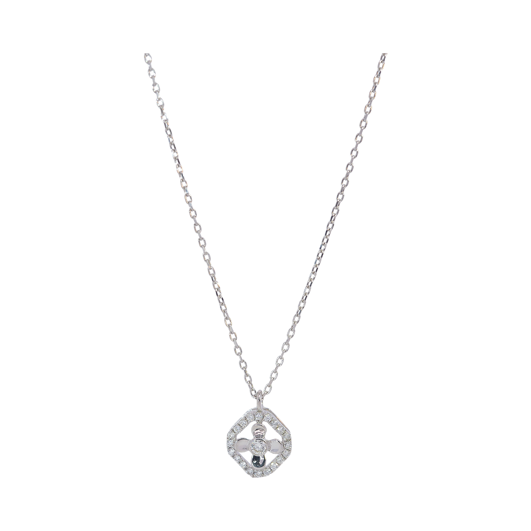This elegant 18K white gold necklace features a delicate floral motif within a soft square-shaped...