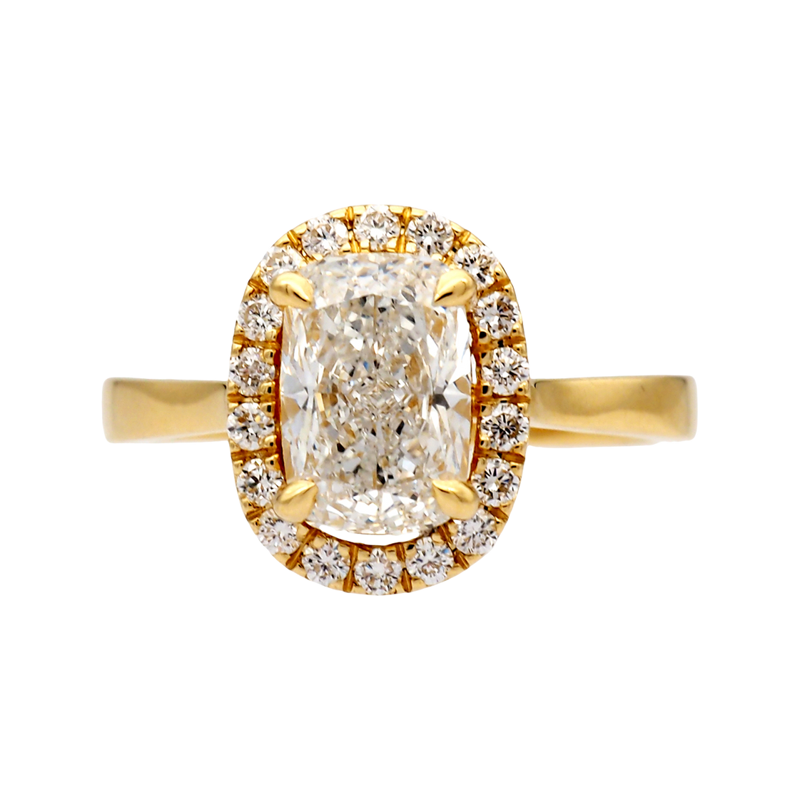 Stunning yellow gold halo ring featuring a cushion cut lab grown diamond surrounded by sparkling...
