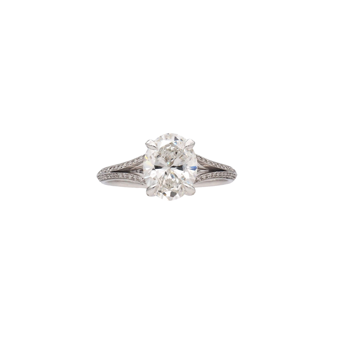 A timeless engagement ring featuring a stunning oval-cut lab grown diamond at its center, gracefully...
