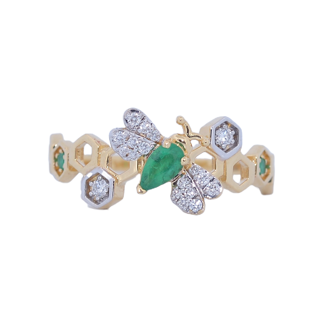 Celebrate nature-inspired elegance with this unique 18K gold ring, featuring a honeycomb design set with...