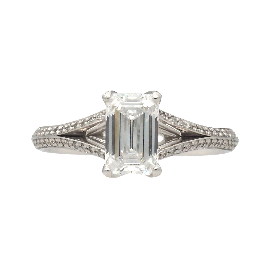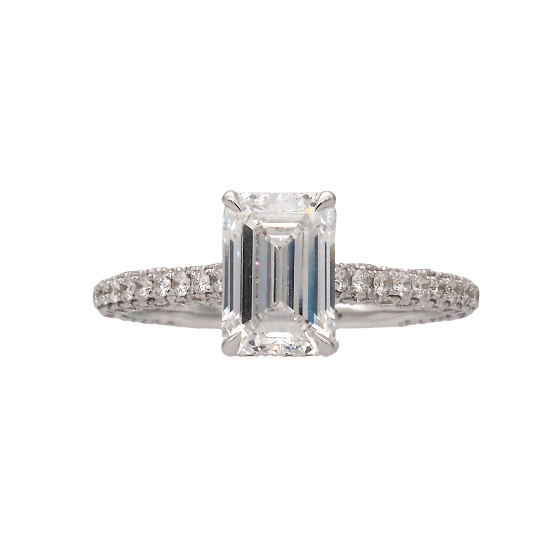 A refined ring featuring an emerald cut lab grown diamond set in a delicate pavé...