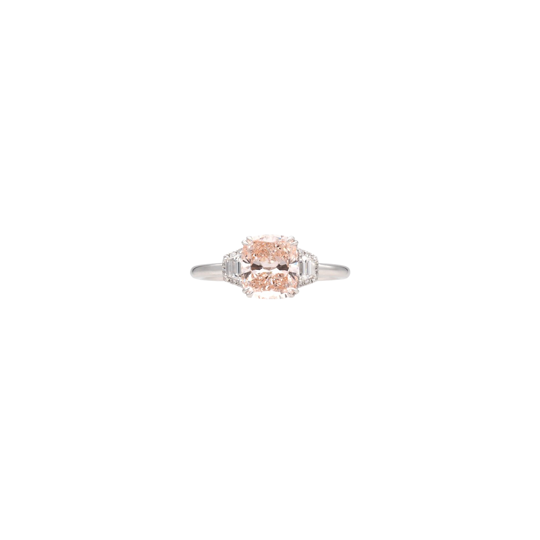 An exquisite lab grown diamond ring featuring a cushion-cut fancy peach center stone complemented by...