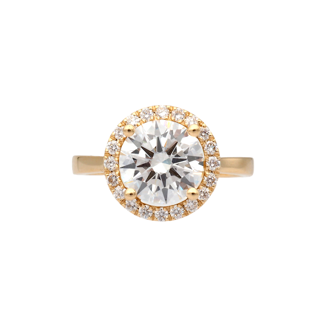 A dazzling lab grown diamond halo ring crafted in luxurious yellow gold, featuring a brilliant...