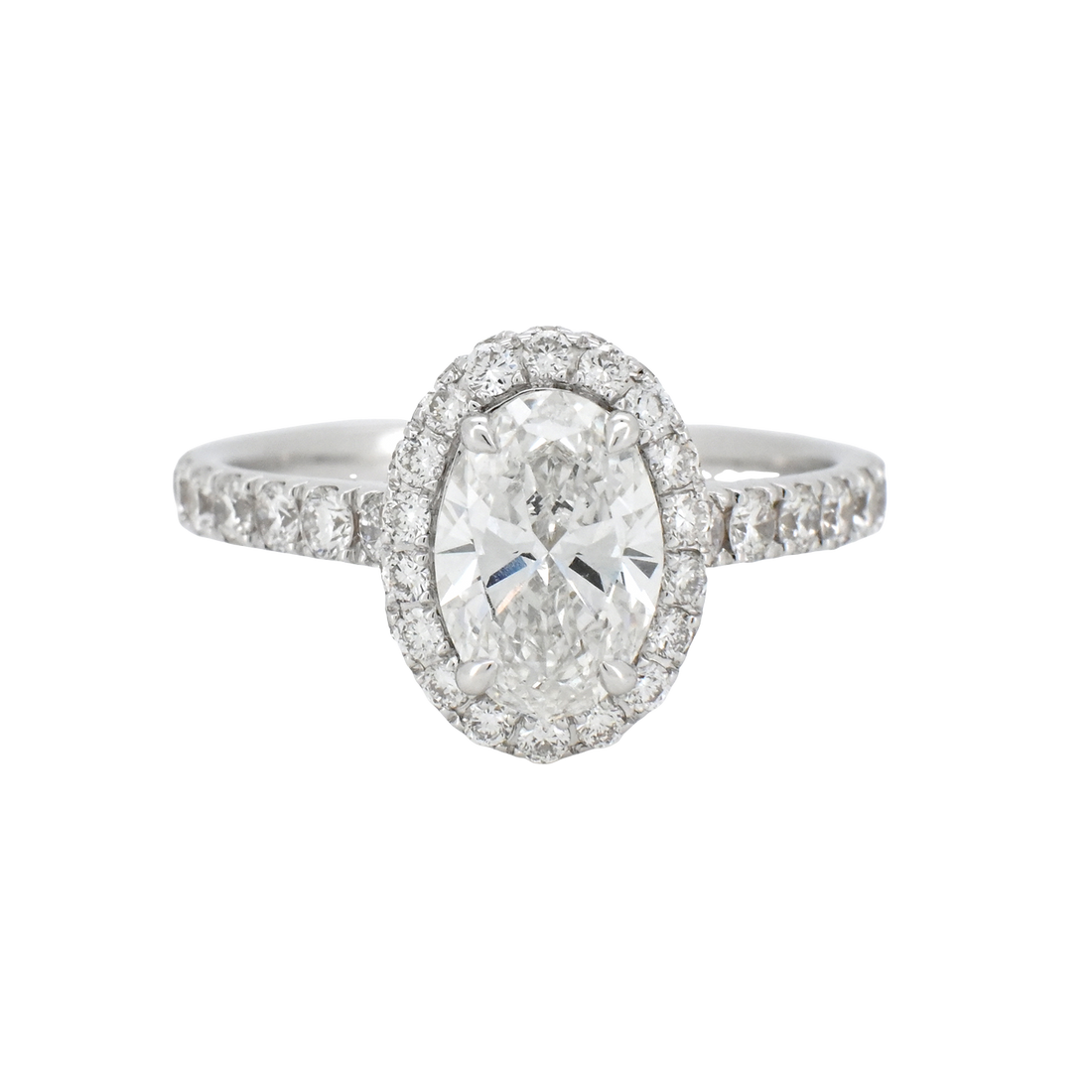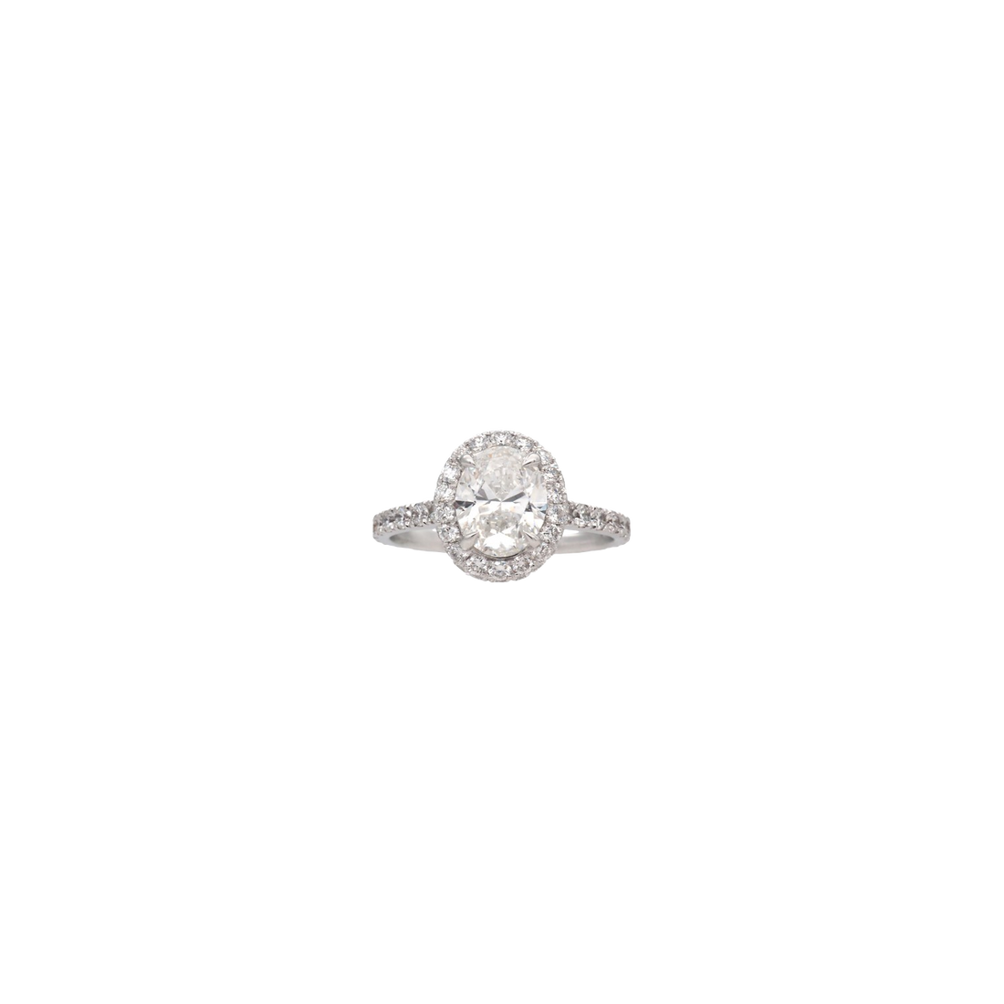 This stunning ring features an oval-shaped lab grown diamond gracefully surrounded by a sparkling halo...
