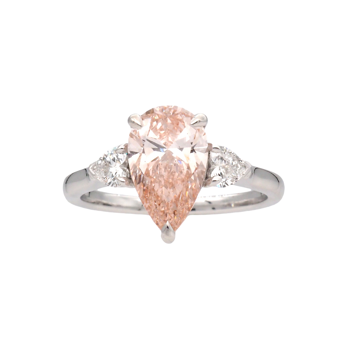 This ring showcases a stunning pear-shaped lab grown diamond in a warm blush tone, beautifully...