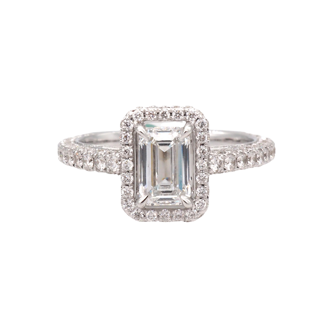 A luxurious 18K white gold halo ring featuring a stunning emerald-cut lab grown diamond surrounded...