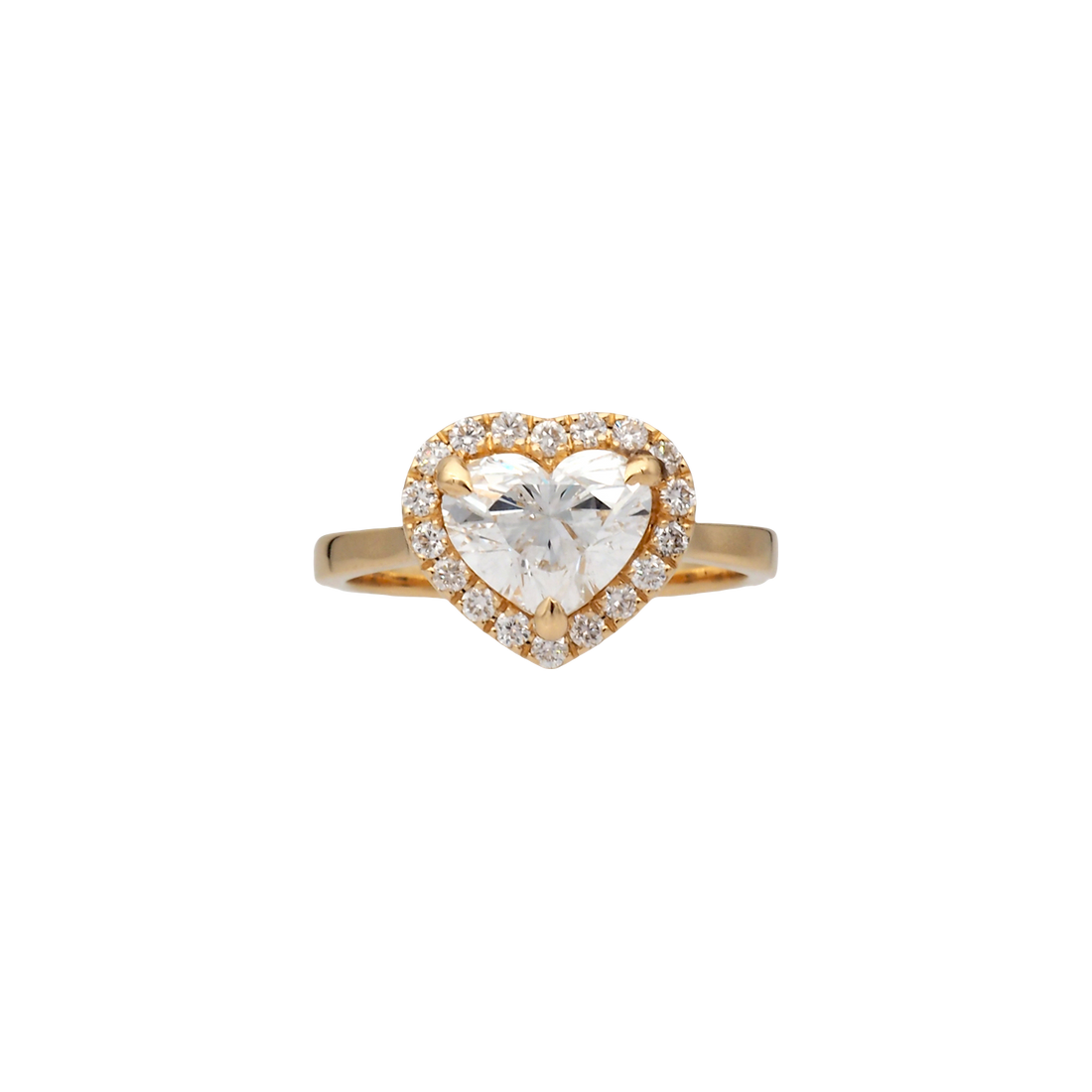 Charming yellow gold halo ring featuring a heart shape lab grown diamond surrounded by sparkling...