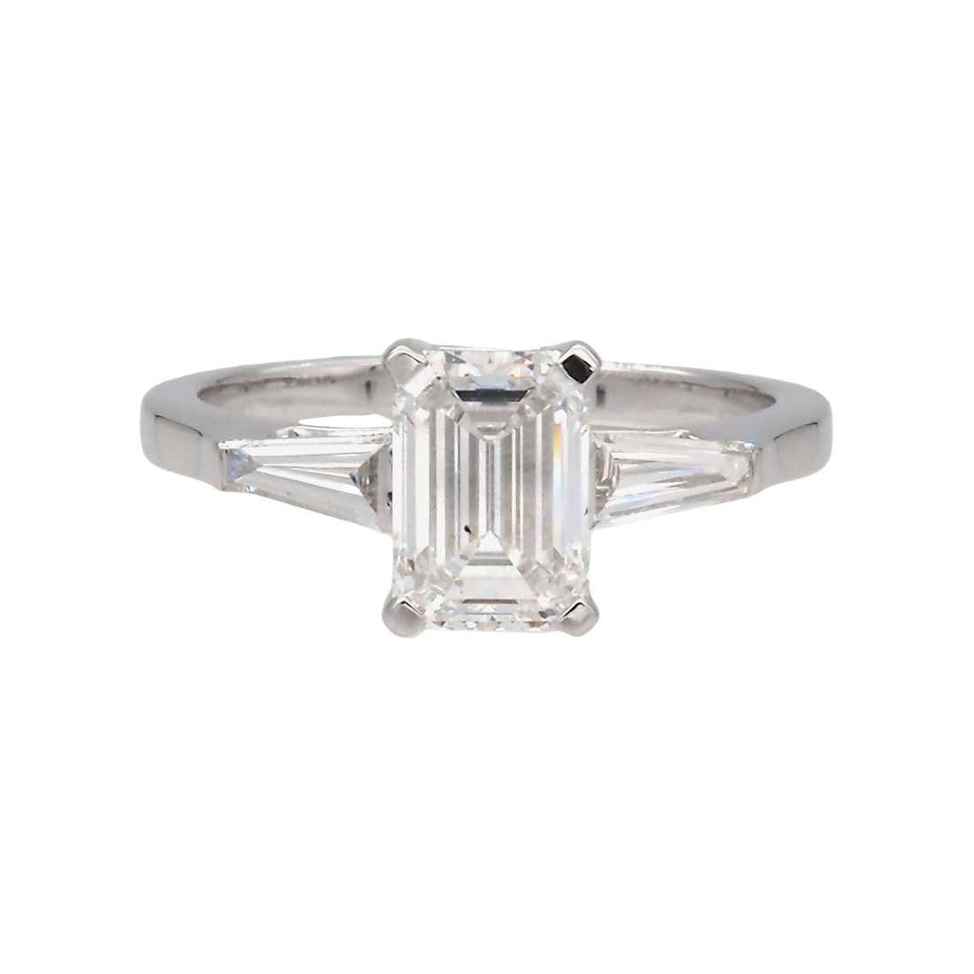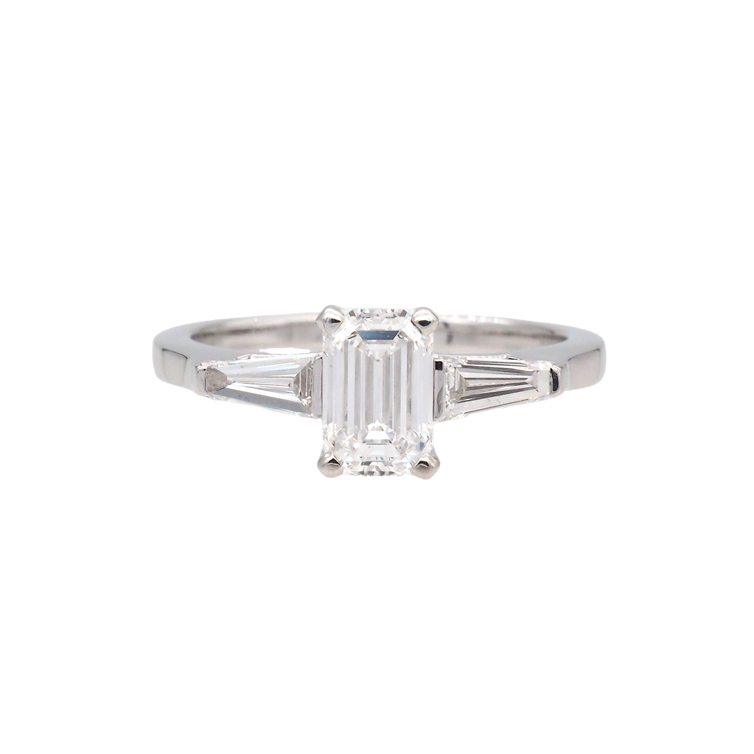 Elegant white gold ring featuring an emerald cut lab grown diamond accented with tapered side...