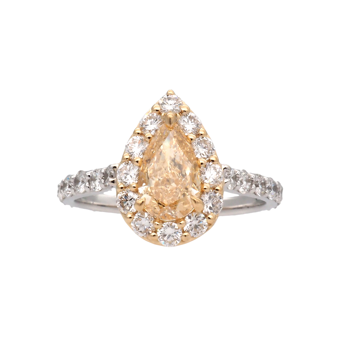 Stunning two-tone gold halo ring featuring a fancy pear shape lab grown diamond accented with...