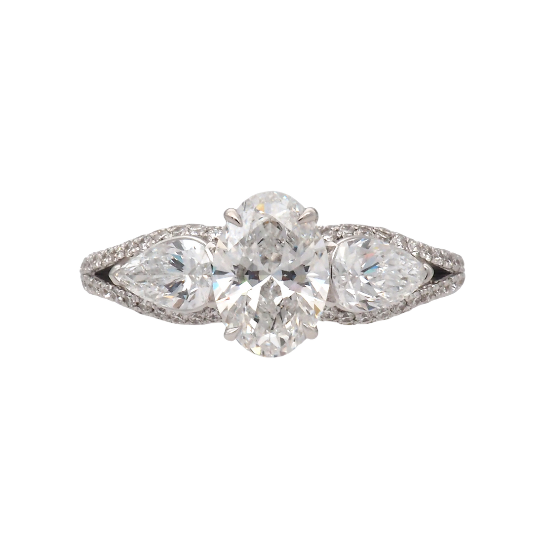 A refined three-stone ring featuring a stunning lab grown diamond centerpiece flanked by matching pear-shaped...