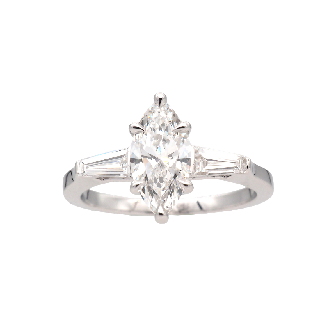 Sleek white gold ring featuring a marquise cut lab grown diamond accented with tapered side...