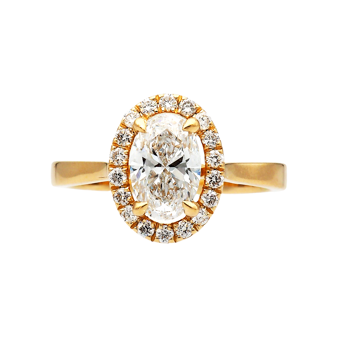 Sophisticated yellow gold halo ring with an oval lab grown diamond surrounded by shimmering stones....