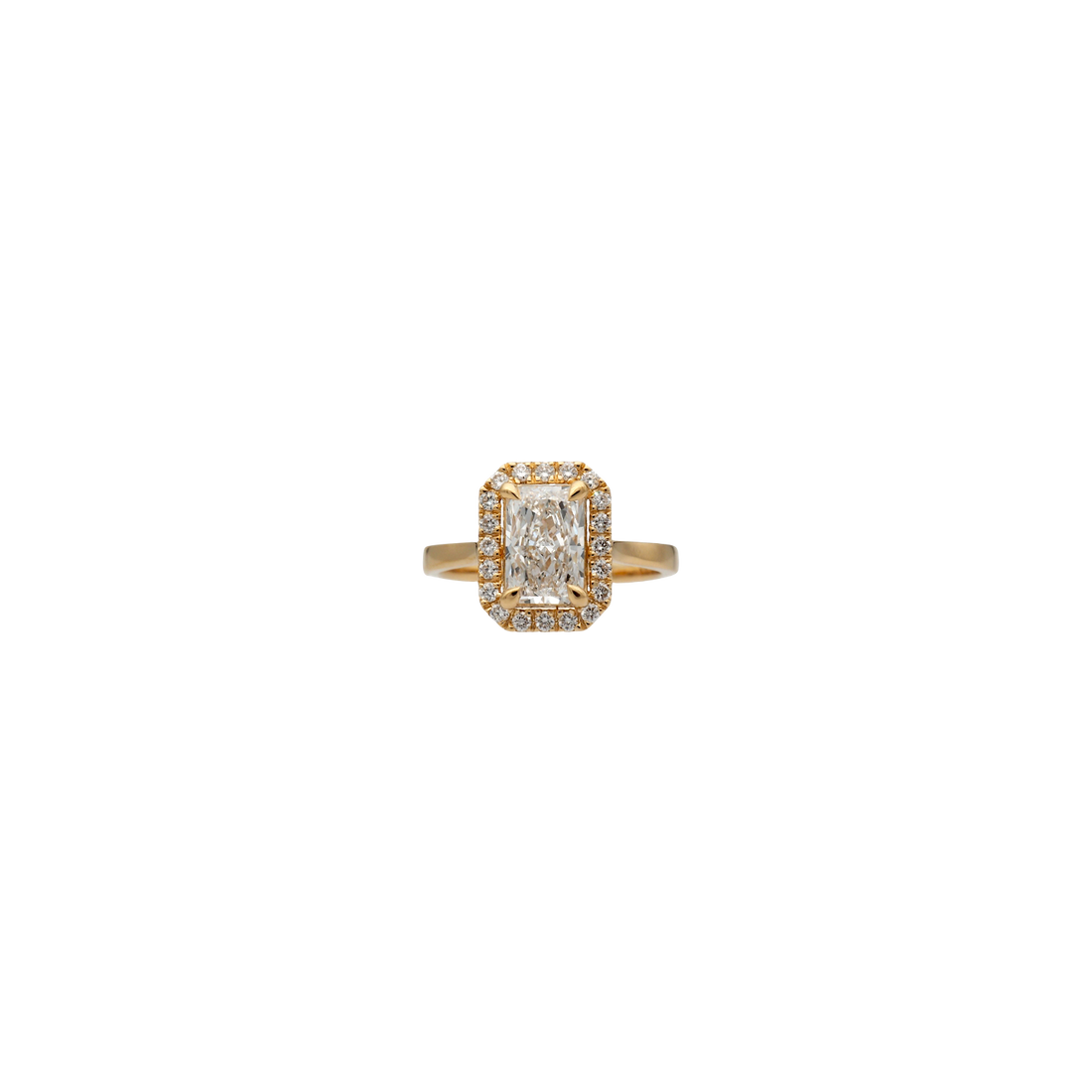 A chic yellow gold halo ring featuring a radiant cut lab grown diamond with shimmering...