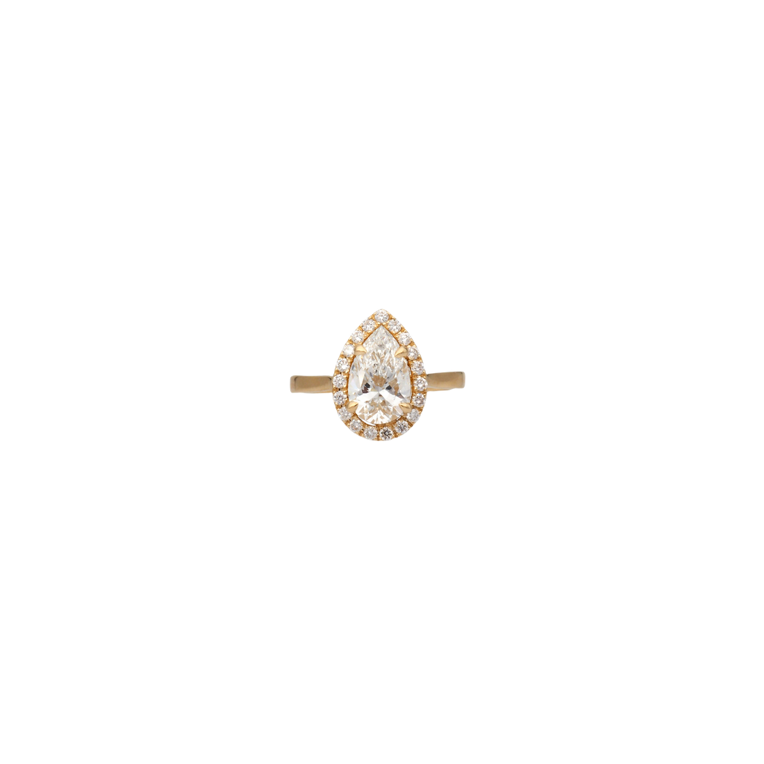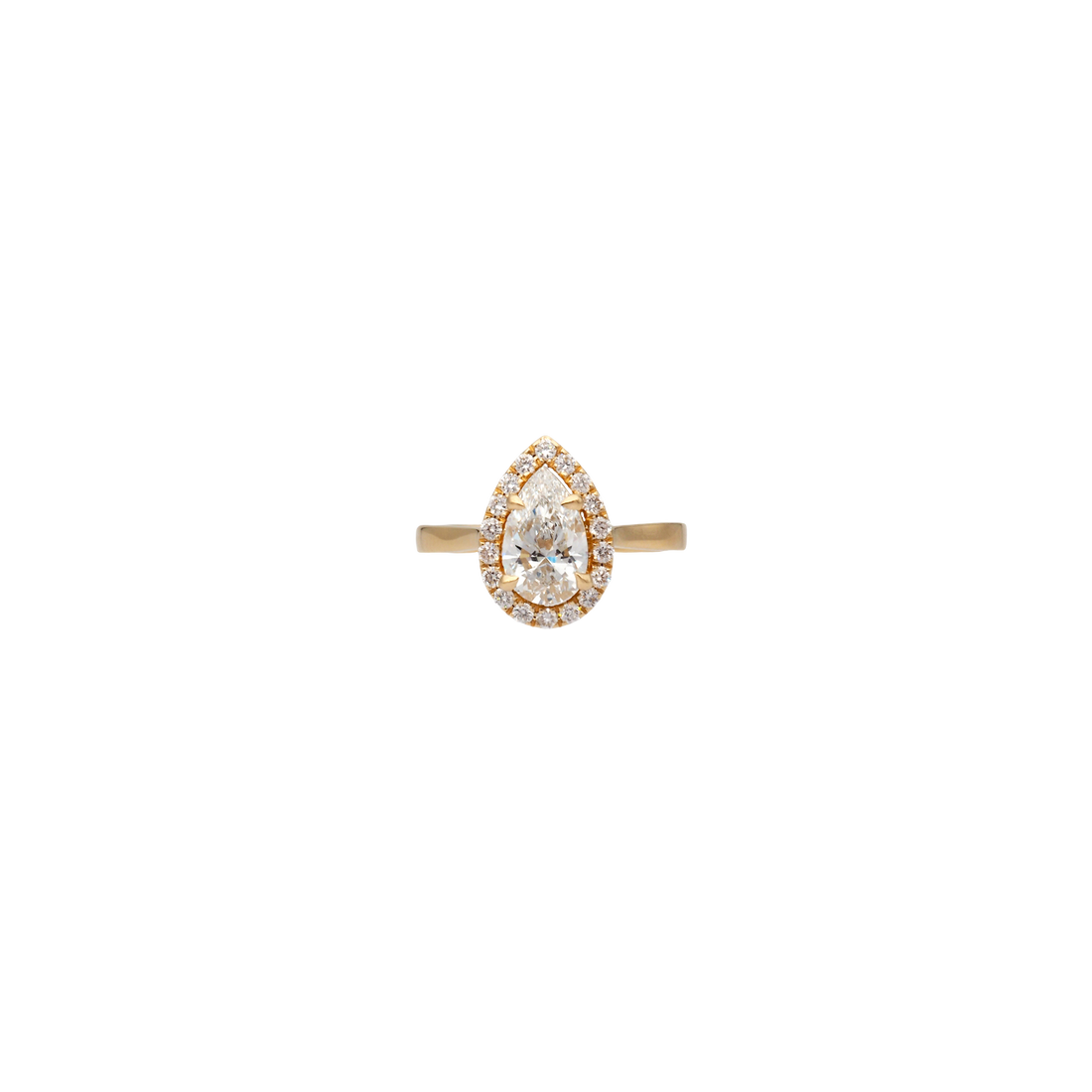 Elegant yellow gold halo ring featuring a pear shape lab grown diamond surrounded by sparkling...