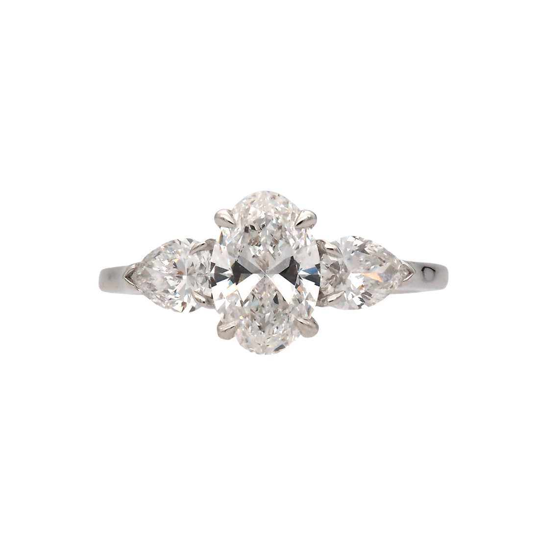 Elegant white gold three-stone ring featuring an oval lab grown diamond flanked by pear-shaped side...