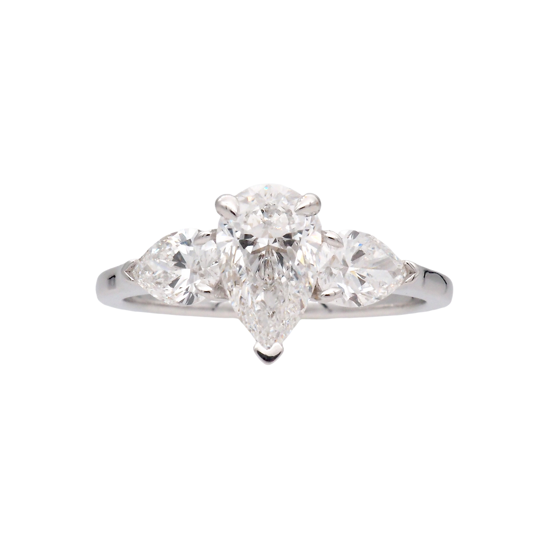 Elegant white gold three-stone ring featuring a pear shape lab grown diamond flanked by matching...