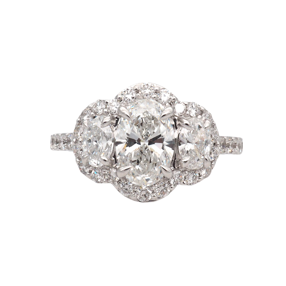 Luxurious white gold three-stone halo ring featuring an oval lab grown diamond flanked by two...