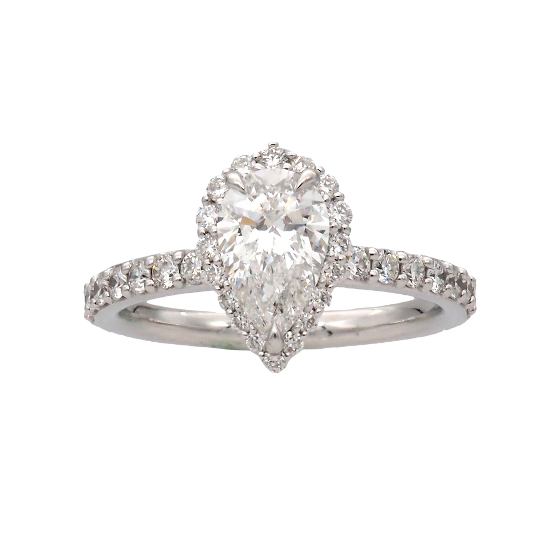 Elegant white gold halo ring featuring a pear shape lab grown diamond surrounded by a...