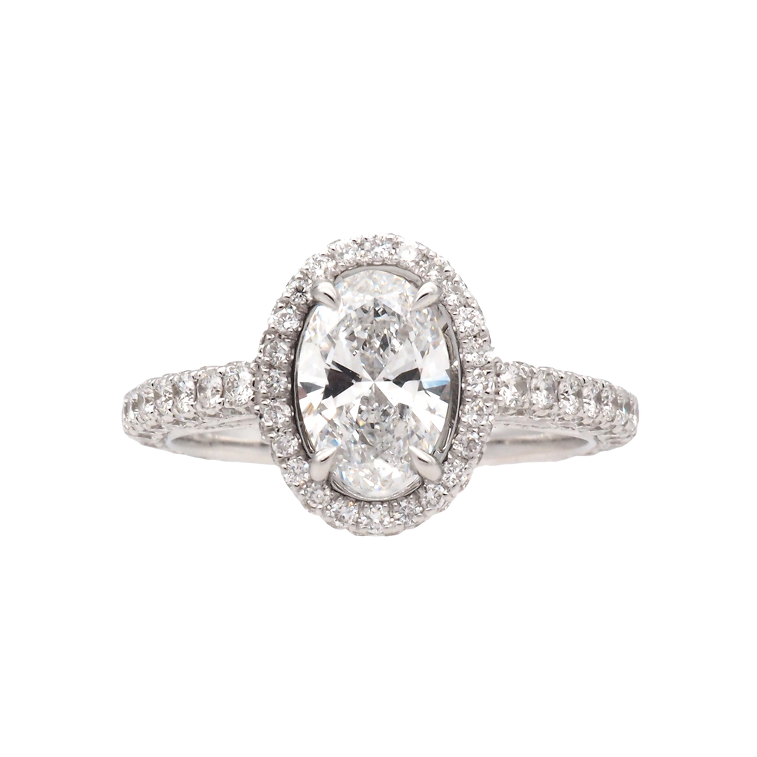 A stunning lab grown diamond ring featuring an oval-shaped center stone surrounded by a shimmering...