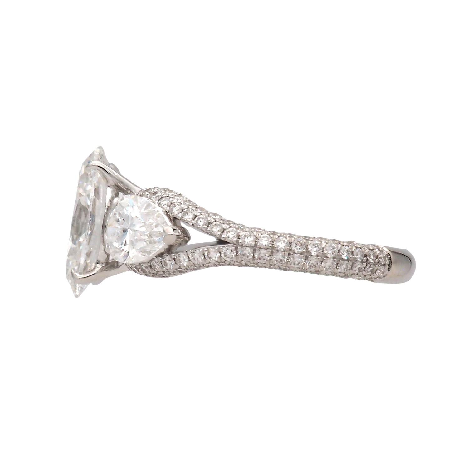 This elegant ring showcases a brilliant oval lab grown diamond at its center, gracefully flanked by two pear-shaped lab grown diamonds on each side. Crafted in premium white gold, it weighs a total of 3.91 grams and features 3.068 carats of dazzling diamonds