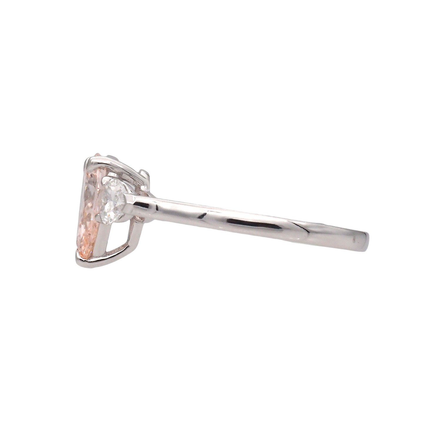 An exquisite lab grown diamond ring featuring a stunning 1.40ct fancy pear-shaped center diamond with two brilliant side diamonds. Total weight 3.18g. Priced at